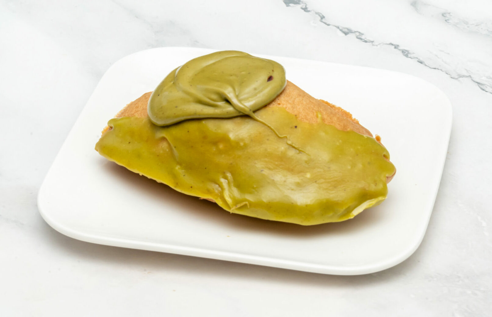 Madeleine XXL pistache cœur cerise : moelleuse, généreuse, avec un cœur cerise fondant et une pistache en notes douces et légèrement torréfiées. Une bouchée, et c’est le coup de cœur. Éphémère du moment.