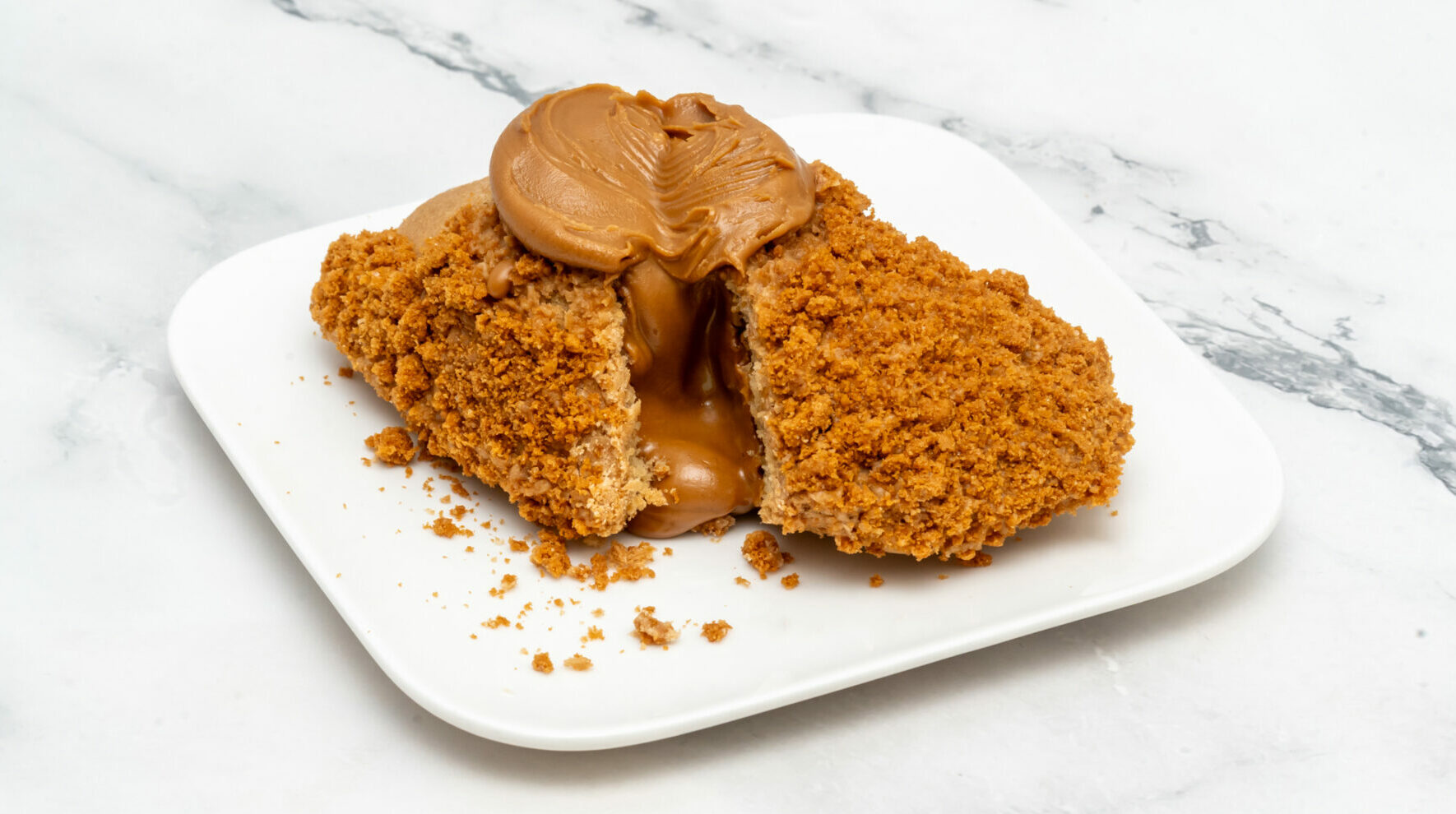 Madeleine XXL moelleuse et généreuse, fourrée d’un cœur spéculoos aux notes de cannelle et de biscuit caramélisé, puis nappée pour encore plus de gourmandise.